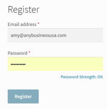 Under “Register”, enter your email address and then create a password. Your password needs to be at least 9 characters long and contain at least one number (0123456789) and one special character (like !@#$%^&”?):