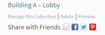 Beneath each collection name, you’ll see options to “Delete” or “Preview” your collection, or “Share with Friends” by email, Facebook, Twitter, or Pinterest. (Sharing options don’t appear if your collection is empty):